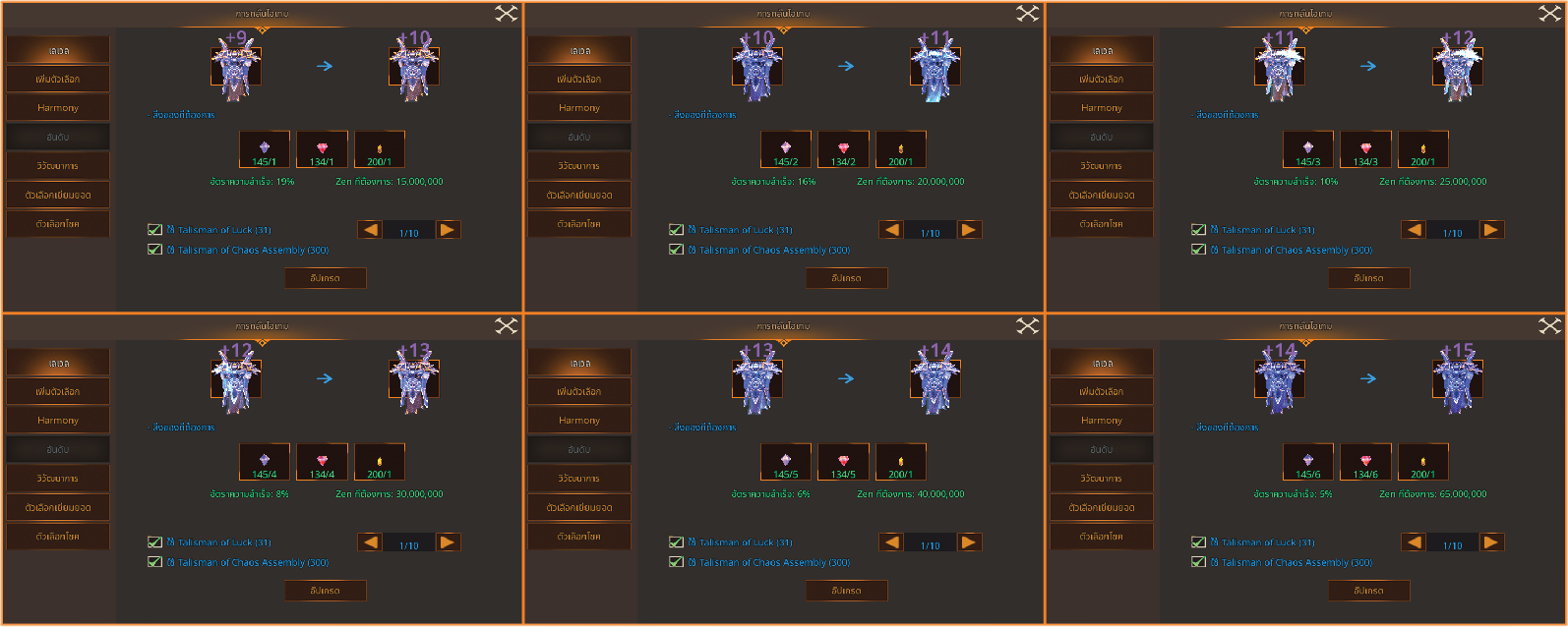 - ในการอัพเกรดจากเลเวล 1 ถึง 6 ใช้ Jewel of Bless 1 ชิ้น