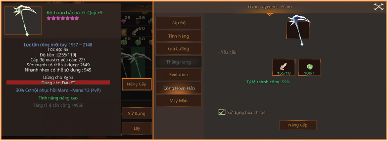 - Nếu thành công: Vật phẩm sẽ có một dòng tính năng hoàn hảo ngẫu nhiên.